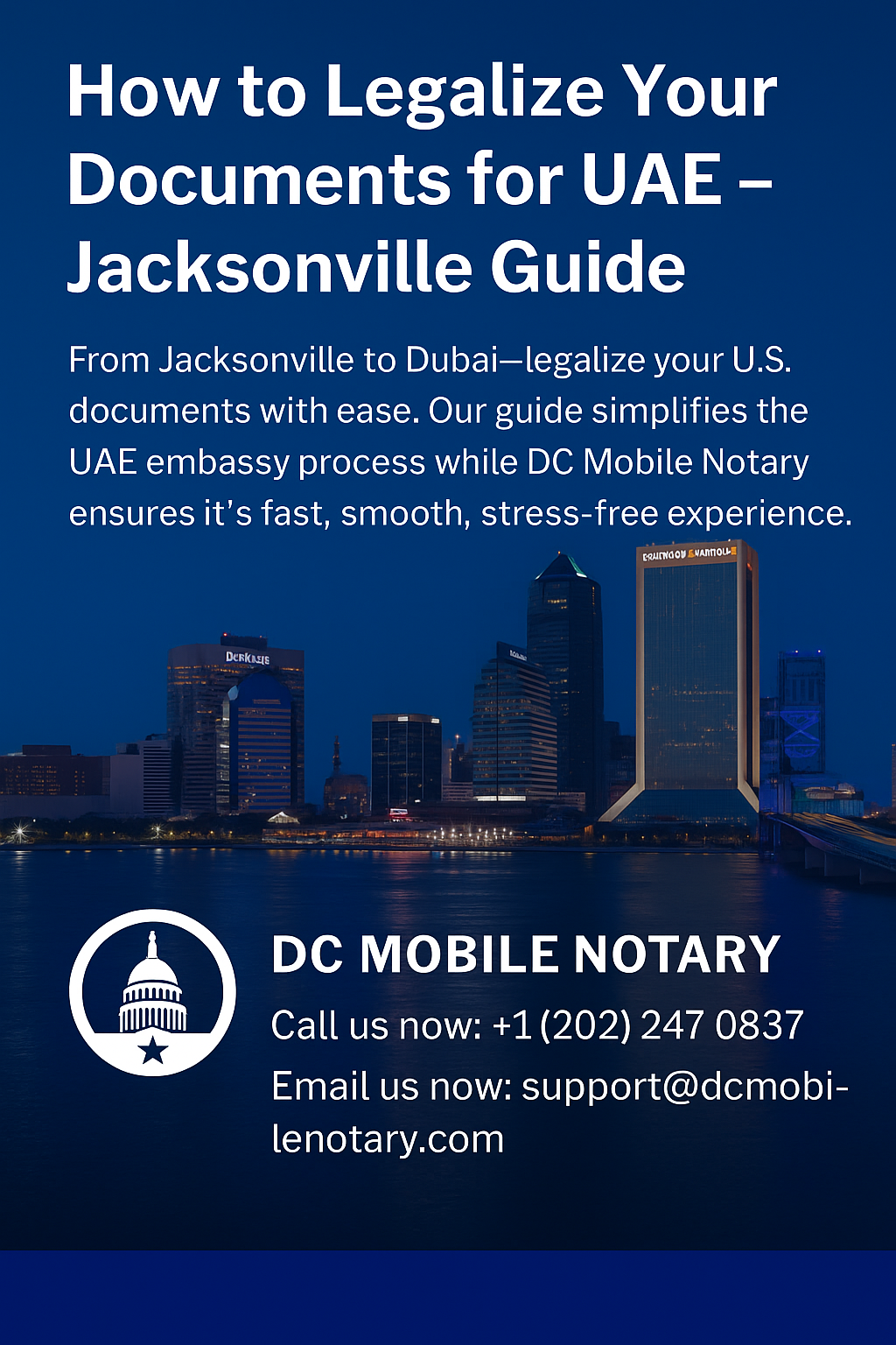 Finally, your documents must be legalized by the UAE Embassy in Washington, D.C. or the UAE Consulate in New York. Jacksonville falls under the New York Consulate’s jurisdiction.